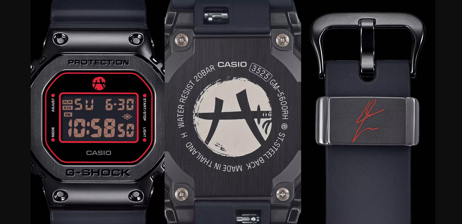 G-SHOCK e Rui Hachimura tornano insieme con il quinto modello firmato! Questa edizione speciale, intensa e resistente, è basata sul GM-5600, caratterizzato dalla distintiva lunetta in metallo. Il potente nero viene ravvivato da accenti rossi vivaci e decisi — i colori del brand G-SHOCK — a rappresentare la forza e la determinazione di Hachimura, che continua a superare ogni limite. Il logo personale “Black Samurai” di Hachimura è presente sulla parte alta del quadrante e sul fondello della cassa. Il logo combina il carattere kanji 八 (hachi in giapponese, che significa ""otto"") con l’immagine di una katana giapponese, formando un motivo a “H” per “Hachimura”. La sua firma è incisa anche sull’anello in metallo del cinturino. Il trattamento ion-plating (placcatura ionica) applicato alla lunetta e ad altri componenti metallici dona all’orologio un tocco raffinato e una texture unica. Le parti in resina della cassa, del cinturino e altre componenti sono realizzate con resina bio-based, pensata per ridurre l’impatto ambientale. Il modello è proposto in un’accattivante combinazione cromatica nero e rosso e viene venduto con confezione originale dedicata. Rui Hachimura Nato l’8 febbraio 1998, a Toyama, in Giappone. Hachimura ha iniziato a giocare a basket alle scuole medie e ha guidato la sua squadra del liceo Meisei, nella prefettura di Miyagi, a tre vittorie consecutive nel Torneo Nazionale delle Scuole Superiori. Ancora studente, è stato selezionato come candidato per la nazionale giapponese. Nel 2016 si trasferisce negli Stati Uniti per frequentare la Gonzaga University, una delle università con il miglior programma di basket NCAA. Nel suo terzo anno, guida i Gonzaga Bulldogs fino agli Elite Eight del torneo NCAA e vince il prestigioso Julius Erving Award come miglior ala piccola della stagione. Nel 2019, Hachimura diventa il primo giocatore giapponese della storia selezionato al primo turno del Draft NBA, firmando con i Washington Wizards. Alla sua prima stagione NBA, gioca 48 delle 72 partite previste e viene inserito nel Second-Team NBA All-Rookie. Nel 2023 entra nei Los Angeles Lakers.